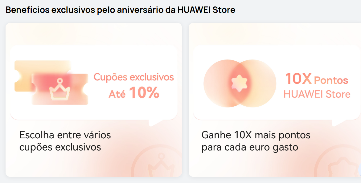 Durante a campanha, a Huawei disponibiliza cupões de desconto aplicáveis a toda a loja online. Até 19 de março, os utilizadores podem utilizar o cupão A10ANV, que garante 10% de desconto imediato em dispositivos e acessórios da marca.