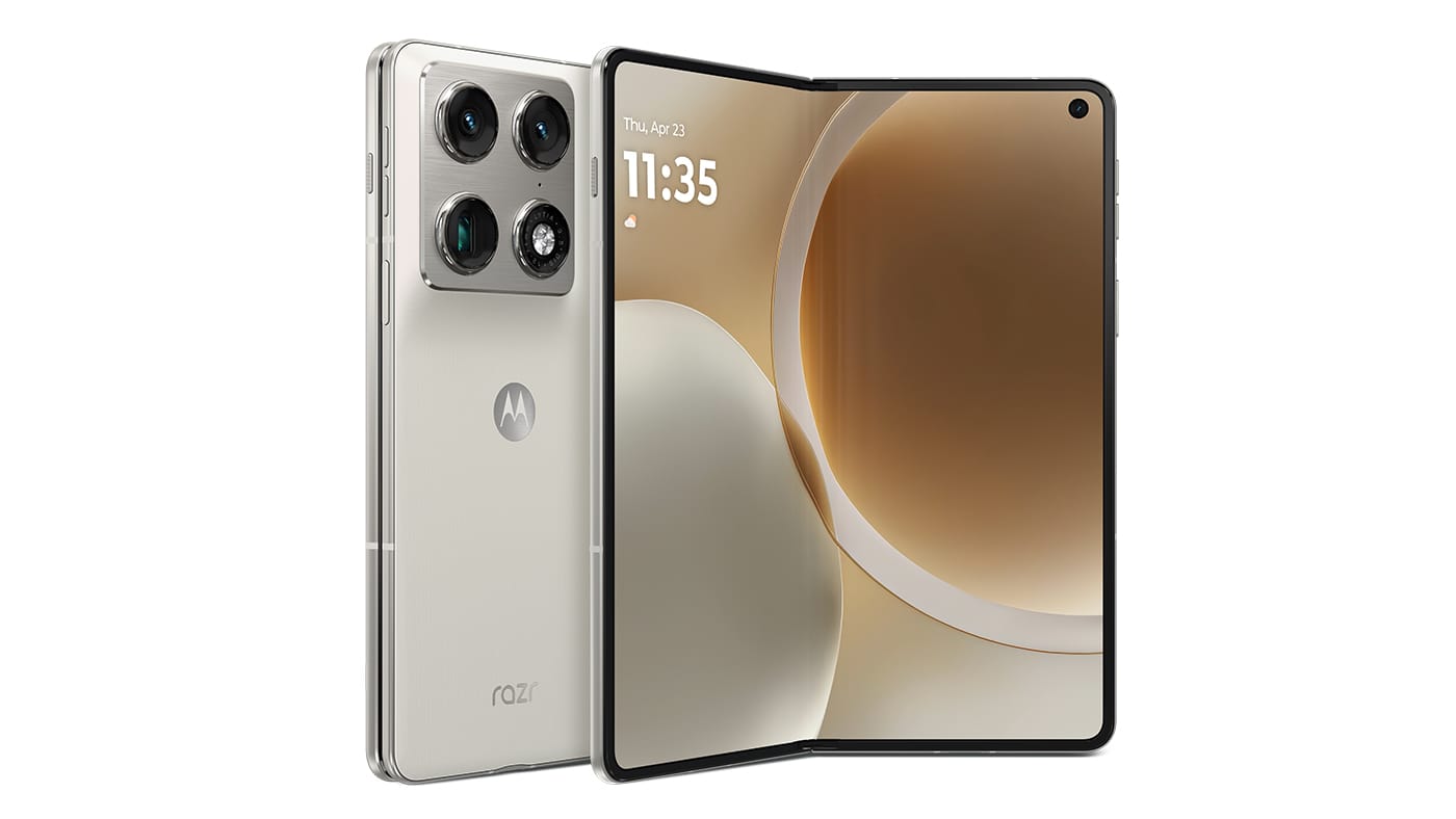 O Motorola Razr Fold é o primeiro dobrável da marca em formato livro e assume-se como o modelo mais ambicioso do portefólio. Integra um ecrã externo de 6,6 polegadas que se abre para um painel interno LTPO 2K de 8,09 polegadas, com uma espessura de apenas 4,55 mm quando aberto e 9,89 mm fechado.