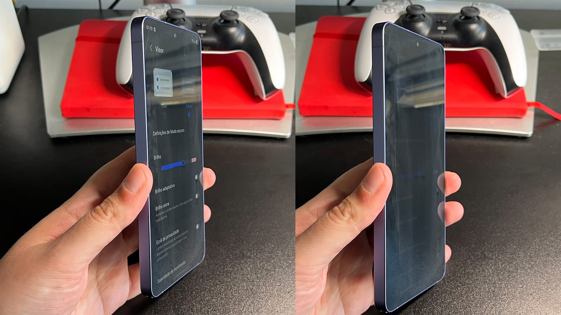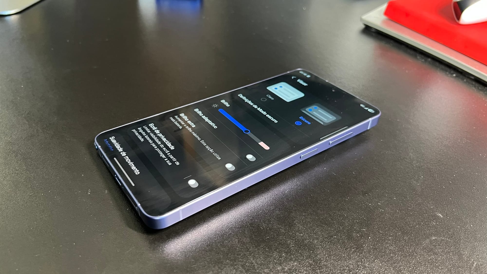 O grande destaque vai para o modo de privacidade. Quando ativo, este modo desliga certos pixeis no ecrã e impede a sua visualização de ângulos laterais. Na minha experiência, funciona exatamente como uma película de privacidade e é realmente uma funcionalidade muito interessante, dado o tamanho do ecrã.